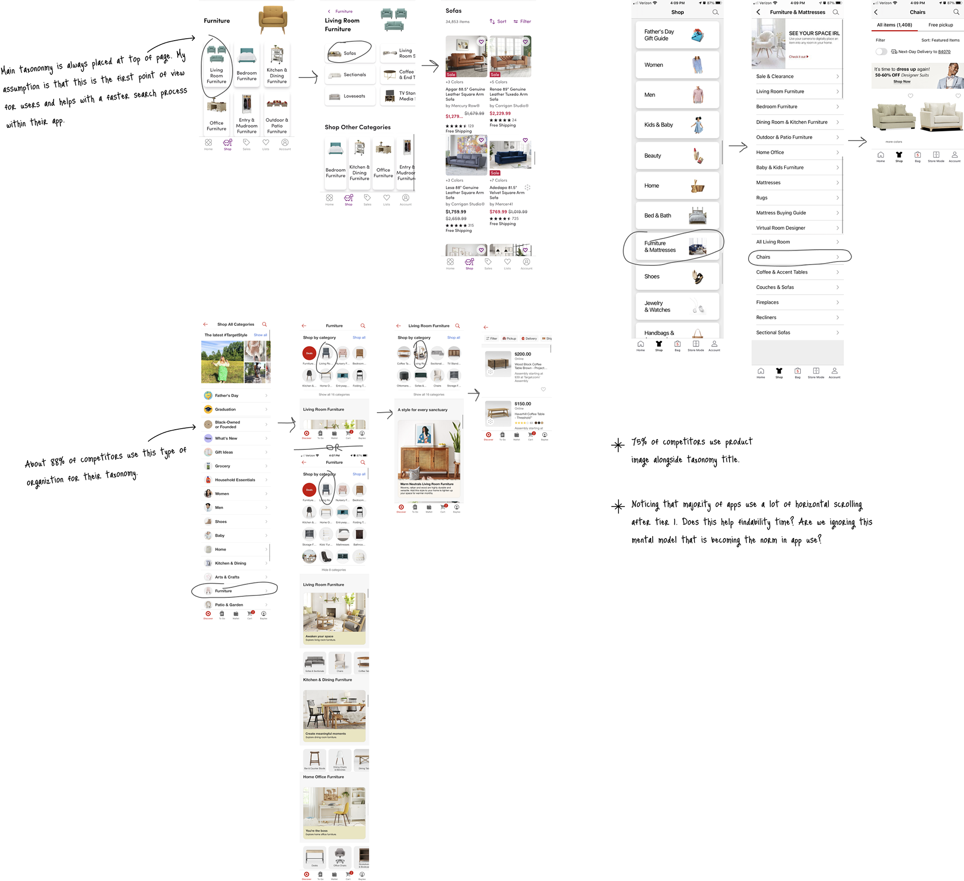 Analyzed 10 competitors to understand common taxonomy and navigation patterns. These insights informed structural and visual decisions for the new app design.